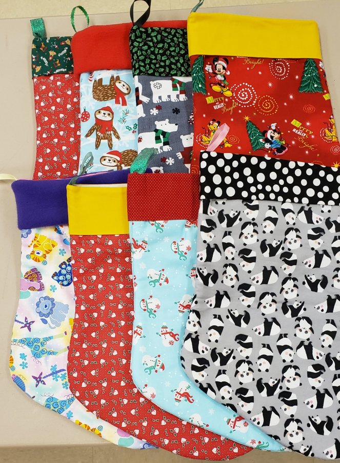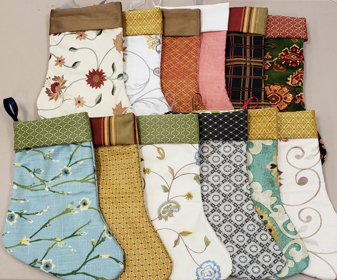 We also got LOTS of stockings done! Check these out:These were made with some great donated upholstery and cotton fabrics from our local art supply thrift store, Indigo Hippo. They were nice enough to open their overflow stash to us, which will be making stockings and quilts for months!