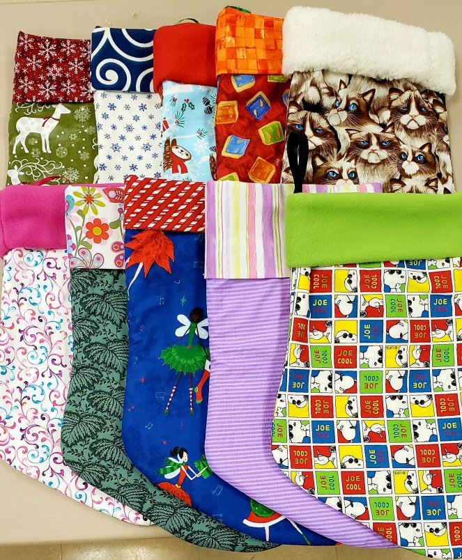 We also got LOTS of stockings done! Check these out:These were made with some great donated upholstery and cotton fabrics from our local art supply thrift store, Indigo Hippo. They were nice enough to open their overflow stash to us, which will be making stockings and quilts for months!