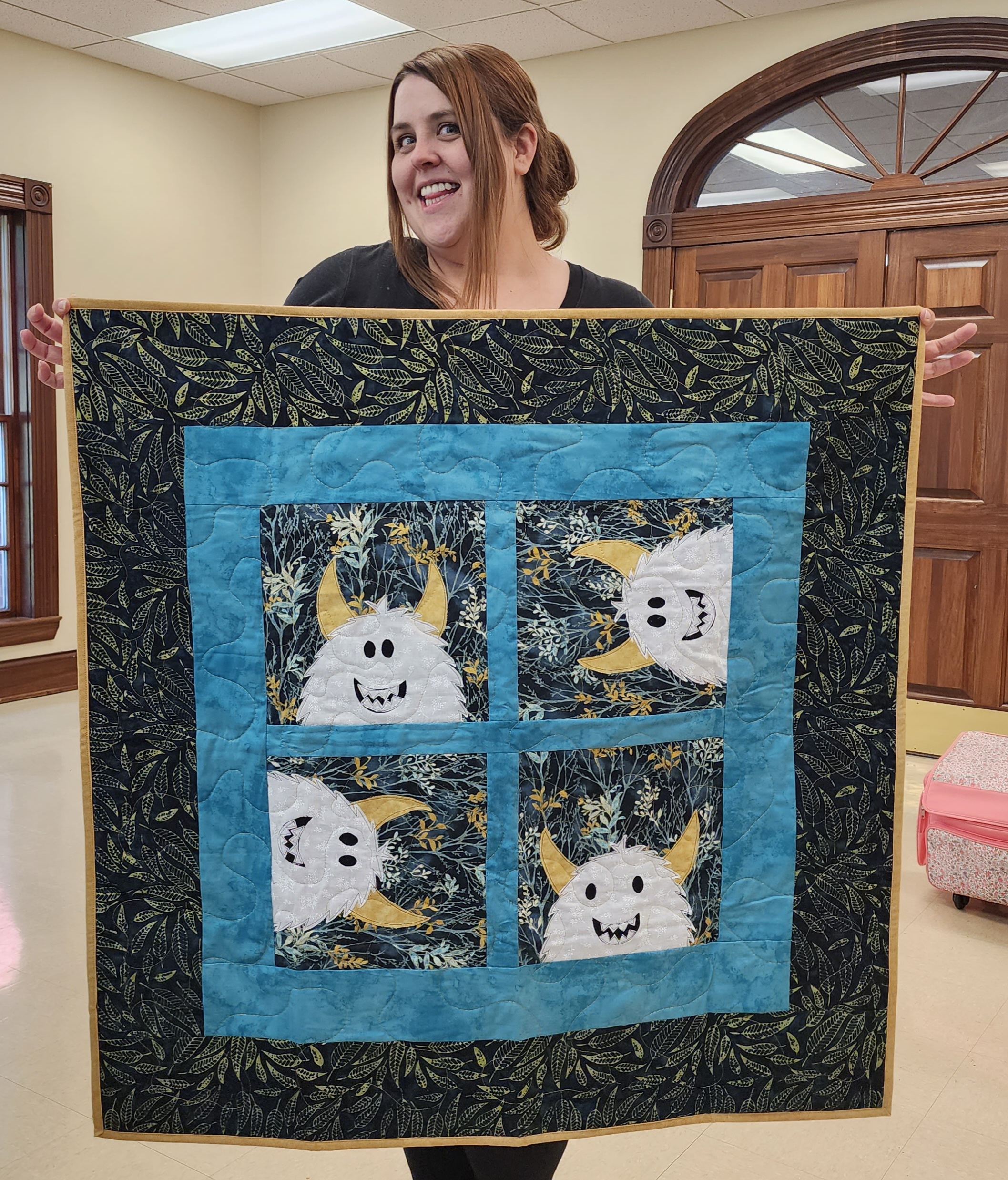 The themes for the month were strips and mythical. I finished my yeti applique from Shiny Happy World which I just had to give to one of our Ft. Thomas Library staff members who recently had a little girl. I hope she likes it!